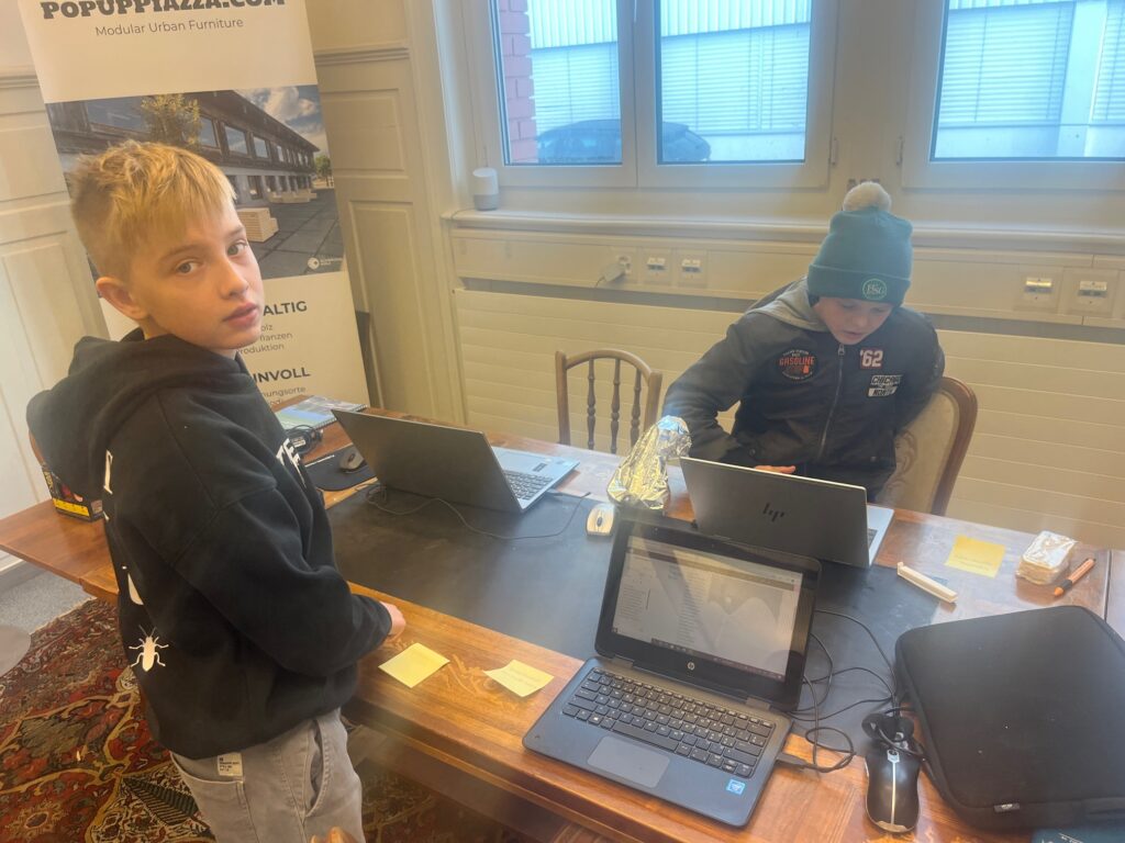 Livia meine Zwillingsschwester, Angelo und Ich sind zuerst zu meinem Götti der Beat heisst gegangen. Er fuhr uns zu seinem Büro der Firma „PopupPiazza“, dass in Uzwil liegt. Er zeigte uns sein Büro, wir starteten unsere Laptops auf um unsere eigene Webseite zu machen. Ich liebe meine Webseite und ich bin sehr stolz drauf :). Livia macht Holzmodele und ich bin etwas neidisch aber Webseiten machen ist besser>:).